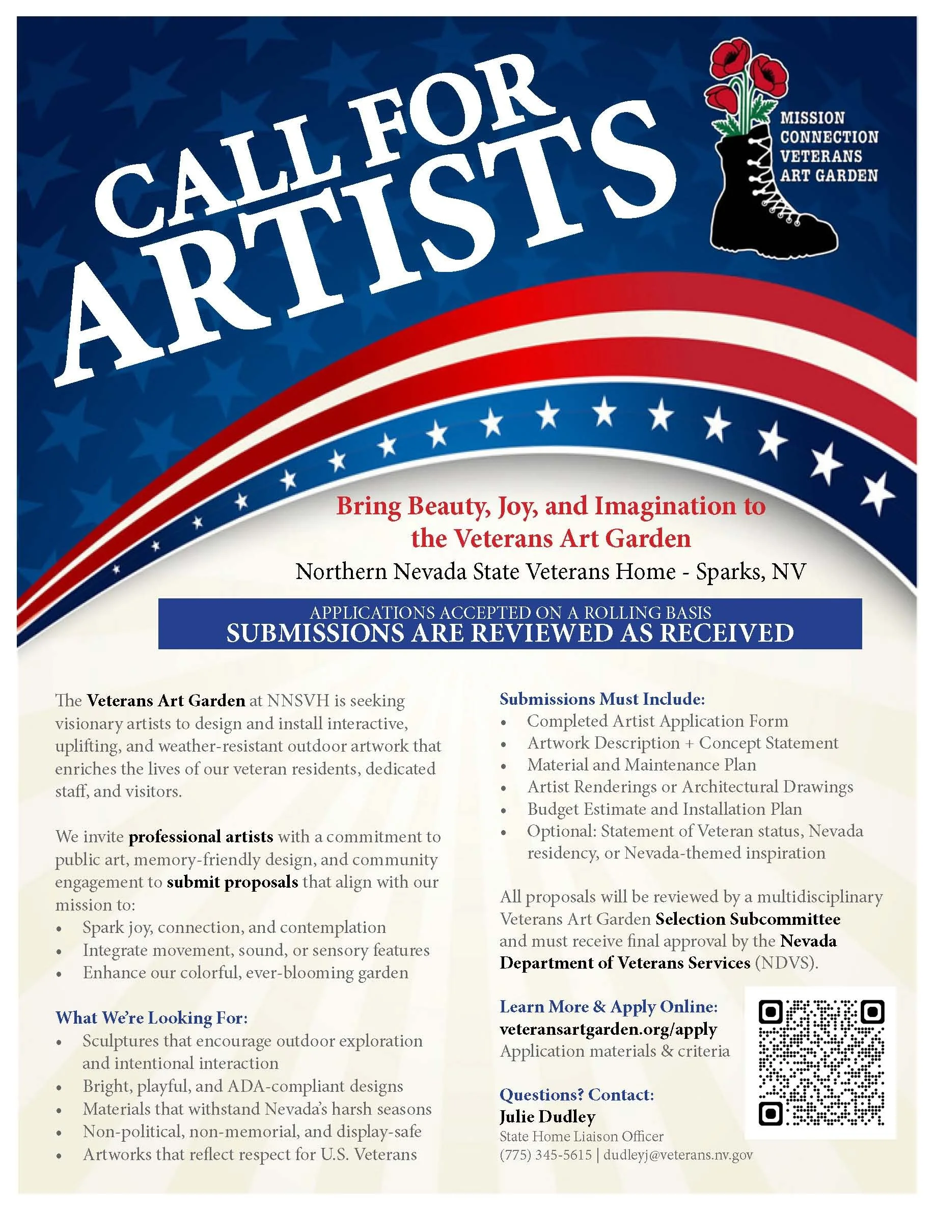 The Veterans Art Garden at the Northern Nevada State Veterans Home (NNSVH) in Sparks, Nevada, is seeking visionary professional artists to design and install interactive, uplifting, and weather-resistant outdoor artwork for its growing garden space.